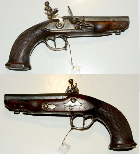 Original Steinschloss-Reisepistole um 1820, Lauf markiert mit "M" mit Krone, Lauflänge 10,6 c,. Gesamtlänge 22 cm. Kaliber 13,5 mm, der Ladestock fehlt, optisch und technisch guter Zustand