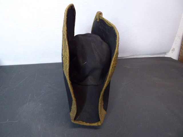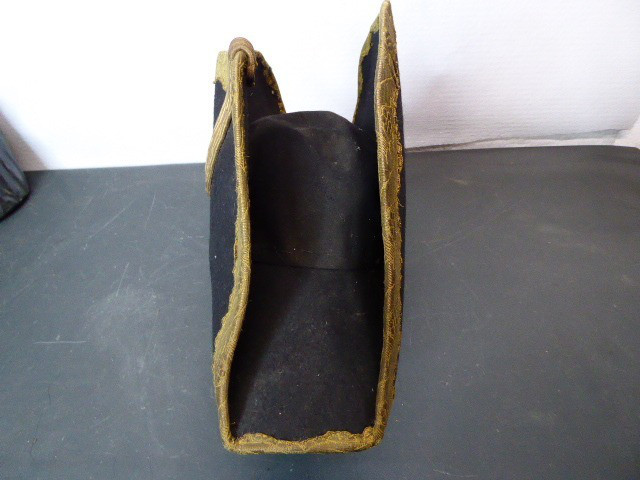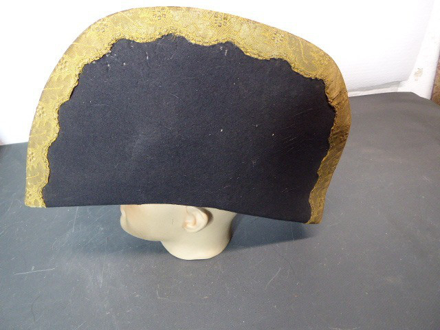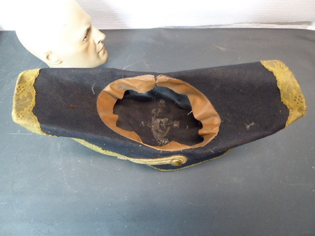 Aus meiner Sammlung gebe ich, ein älteren hohen unbekannten Zweispitzhut Original? mit Goldener Litze umrandet ab. Kenner werden es sicherlich wissen was das für ein Tschako ist. Wahrscheinlich aus Originalteilen für Film und Fernsehen zusammengebaut worden. Korpus besteht aus schwarzen dickem Filz mit breiter Goldlitze umrandet mit Innenfutter und Ledernem Schweißband. Das Teil müsste mal gründlich gereinigt werden. Alles andere entnehmen Sie Bitte den Fotos. Kann zu jederzeit bei mir besichtigt werden. Privatauktion keine Rücknahme und Garantie.