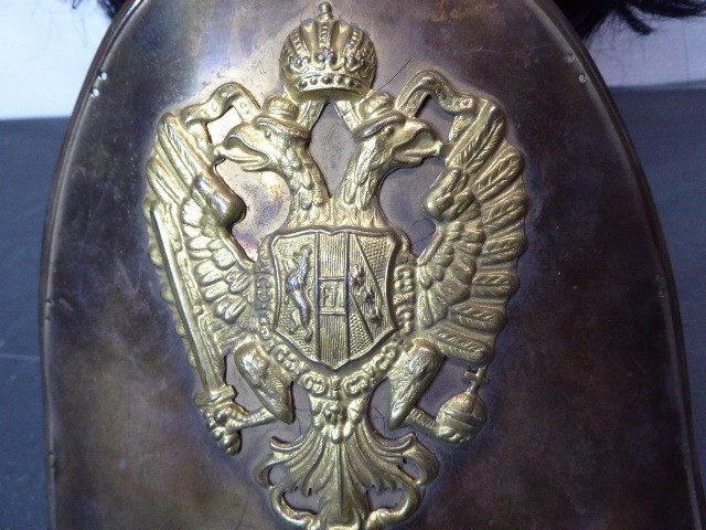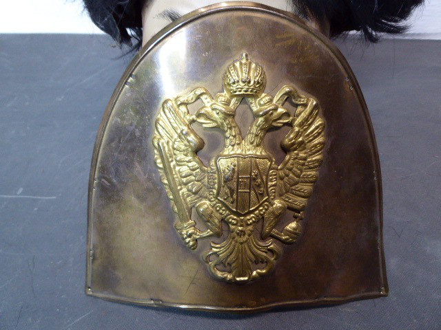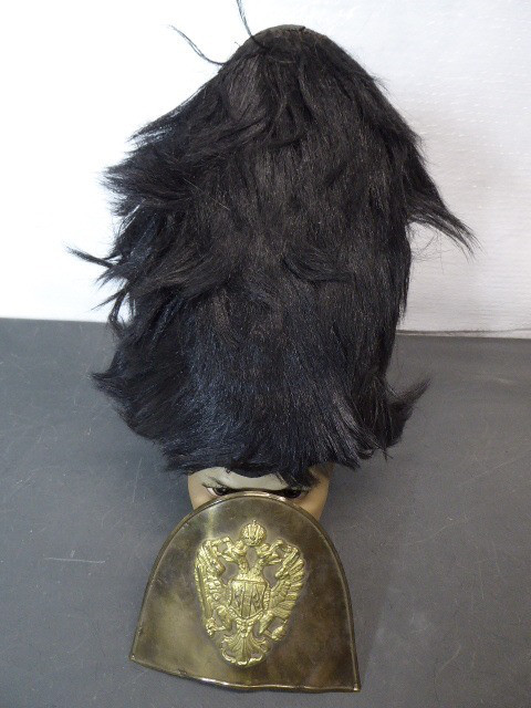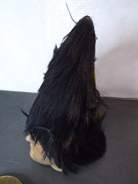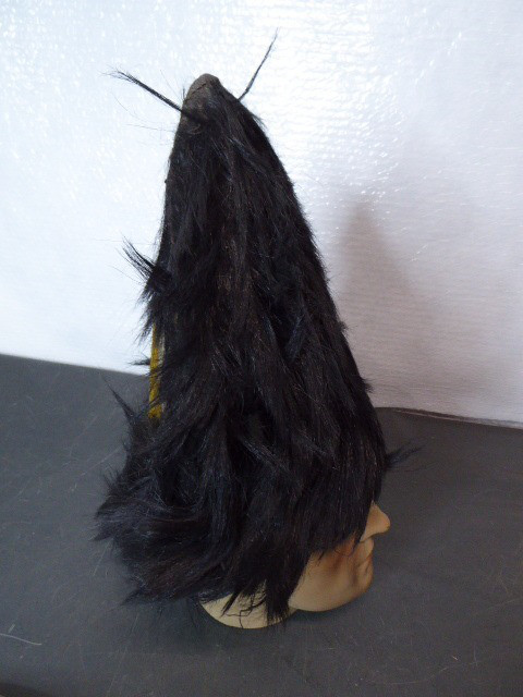 Aus meiner Sammlung gebe ich, eine alte hohe Bärenfell Mütze Original? Messingschild mit aufgesetzten Doppeladler Schild ist abgegangen ab. Kenner werden es sicherlich wissen was das für ein Teil ist und wo es getragen wurde. Wahrscheinlich aus Originalteilen für Film und Fernsehen zusammengebaut worden. Korpus besteht aus schwarzen Fell hinten aus hellem Stoff mit Gelber breiter Litze, innen mit dunklem Innenfutter. Das Teil müsste mal gründlich gereinigt werden. Alles andere entnehmen Sie Bitte den Fotos. Kann zu jederzeit bei mir besichtigt werden. Privatauktion keine Rücknahme und Garantie.