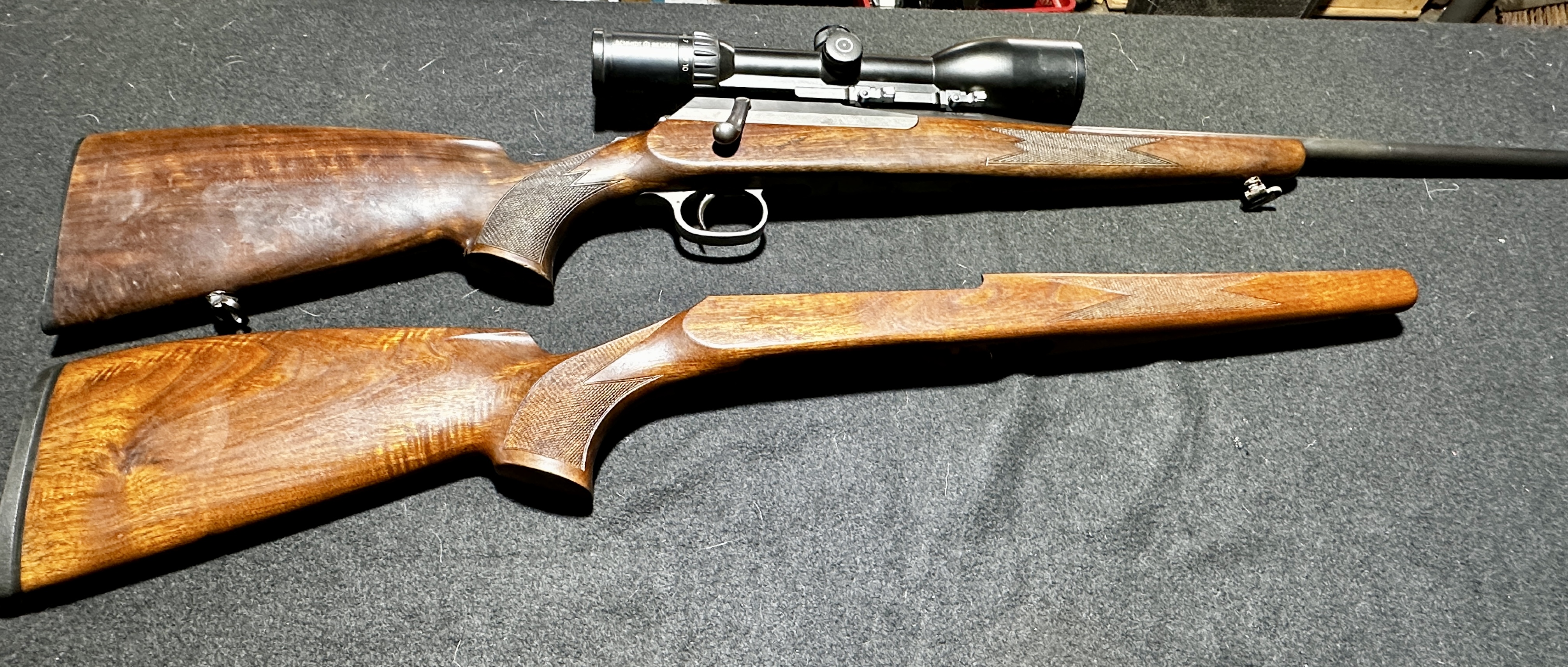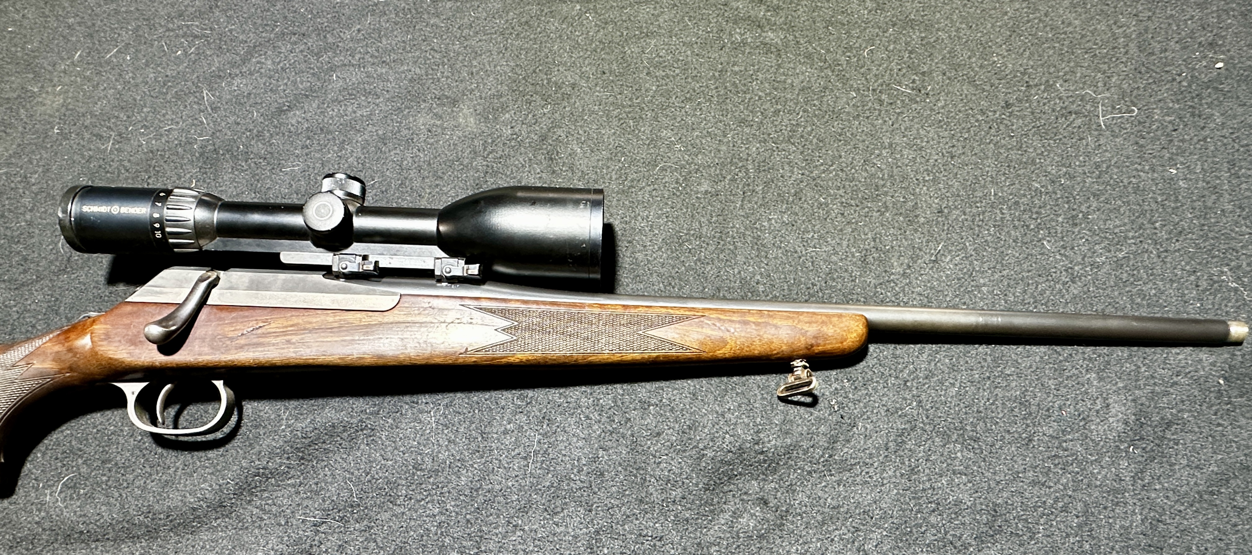 Der Vorderschaft hat einen vom Büchsenmacher geklebten Riss, welcher keinen Einfluss auf die hervorragende Schussleistung der Waffe hat. Ein neuwertiger, original KR1 Schaft ist mit dabei. Auf der Waffe ist ein Schmidt und Bender Zenith 2,5-10x56 mit Merkel Aufkippmontage. Das Glas ist in sehr gutem Zustand, Linsen sind ohne Kratzer.
