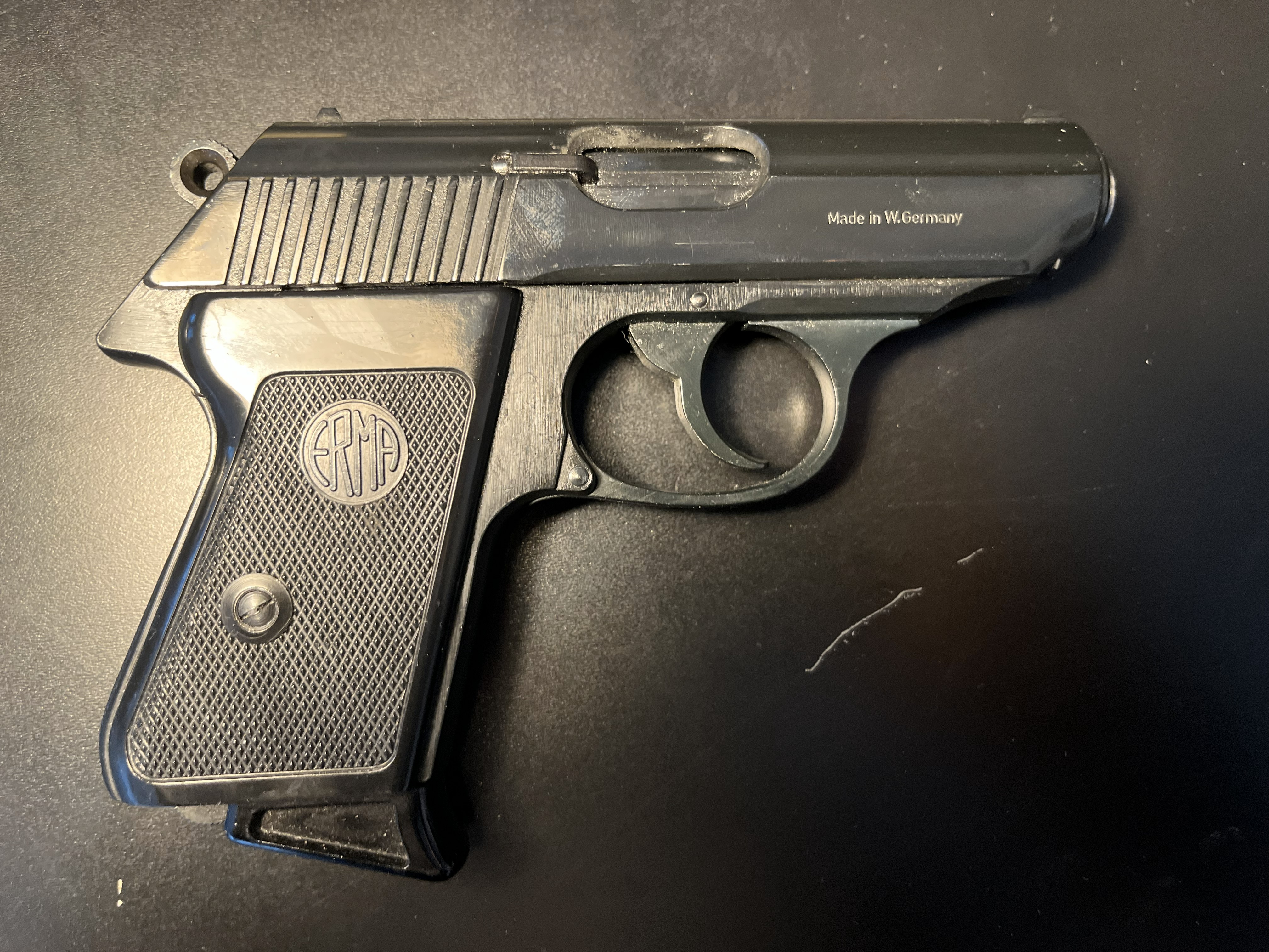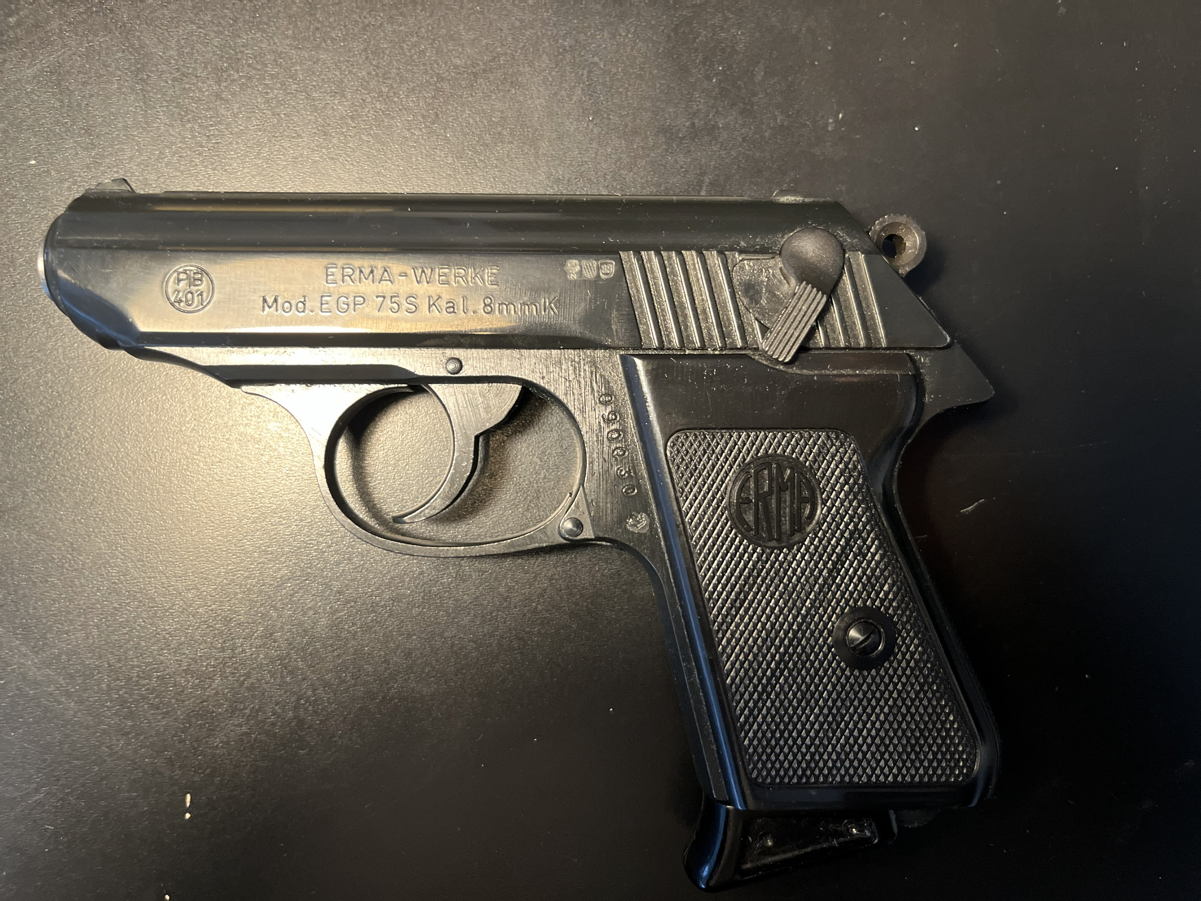 Walther PPK, Nachbau von Erma, Typ 75s, 8mmK. Gebrauchsspuren, siehe Bilder, vor allem im Bereich des Auswurffensters.
