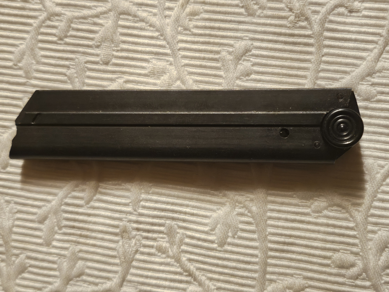 08-Magazin. Aus Sammlerbestand neuwertiges Magazin zu verkaufen. Keine Herstellerangabe auf dem Magazin zu finden. Plastikboden mit Ringen, siehe Bilder. Sehr starke Feder, nichts ausgeleiert. Als Ersatzmagazin im Schrank gelegen.