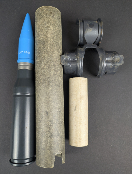KOMPLETT LEER UND FREI VON GEFAHRSTOFFEN - ÜBUNGSMUNITION 25X137 PATRONE MIT PACKHÜLSE UND GURTGLIED - OHNE ZÜNDHÜTCHEN
