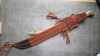 Scheide: Aufwendig gearbeitete Prunk-Lederscheide mit traditionellen Punzierungen, Flechtungen und Fransen-Applikationen.