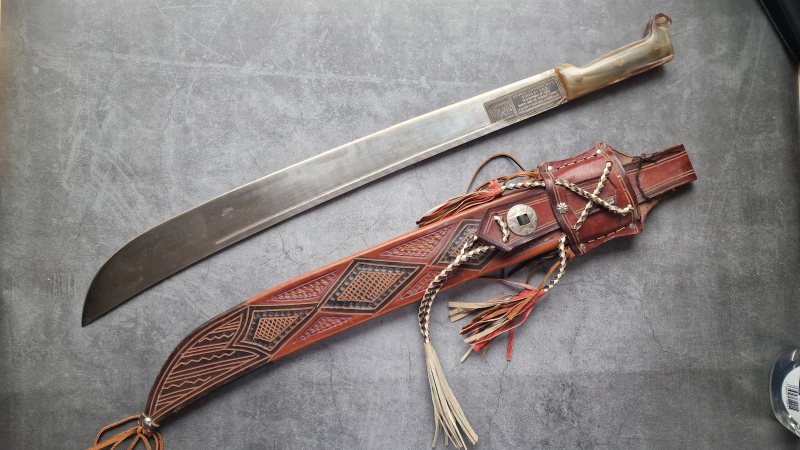 Zum Verkauf steht eine klassische spanische Machete der Traditionsmarke „Dos Leones“ (Albacete). Es handelt sich um ein hochwertiges Sammlerstück im „New Old Stock“-Zustand, das vermutlich aus den 1970er oder 80er Jahren stammt.