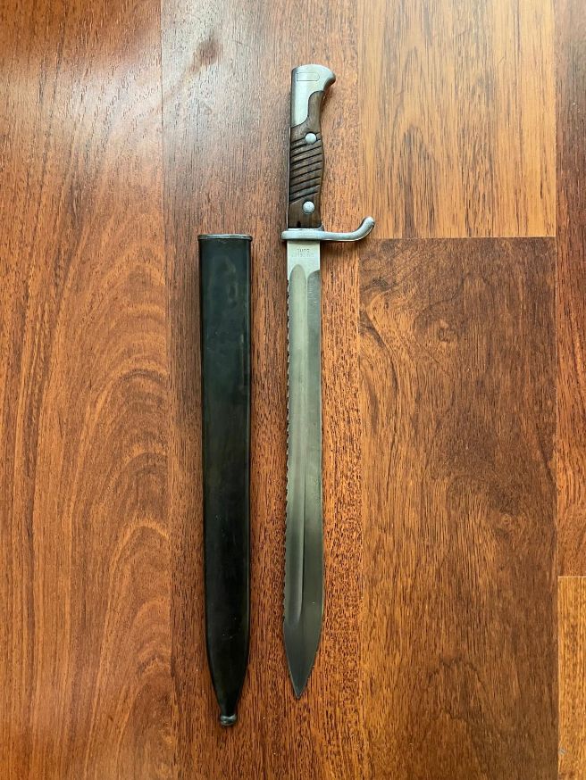 Sehr schöne Bajonett 98/05 mit Sägerücken und brunierte Stahlscheide schöne Abnahmestempelung .Alles noch in eine sehr guter zustand.Hersteller Simpson c& Co. Suhl