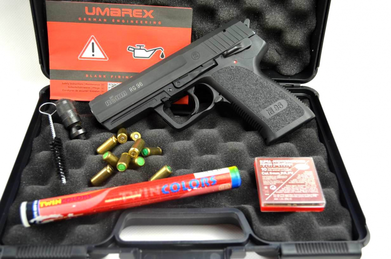 Röhm RG 96 im originalen Karton, mit benutzterm Pyrobecher, Reinigungbürste „Warnhinweis“, 10 Wadie Supra Gaspatronen, 10 Messing Platzpatronen und einer vollen Röhre Zink Wechselsterne!