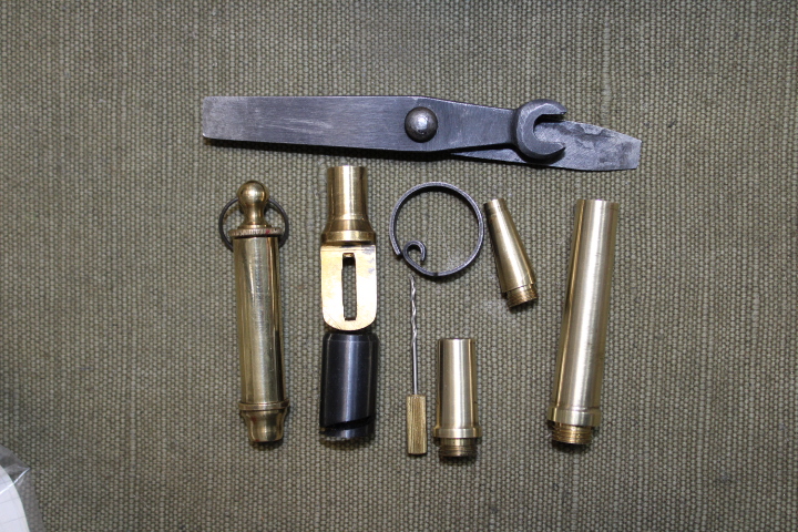 Verkaufe ein Konvolut (9 Teile) gebrauchtes, gut erhaltenes Vorderladezubehör bestehend aus: Kombiwerkzeug, Füllstutzen, Räumnadel, Feder für Pulverflasche, Pistonfüller, Krätzer und Lappenhalter (Durchmesser ca. 14mm).