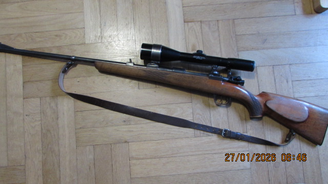 Solide Repetierbüchse mit 98er System, dt. Stecher, dt. Backe, Flügelsicherung, Kimme und Korn, Festmagazin für 4 Patronen , gültiger Beschuss ist vorhanden. Zielfernrohr Nickel 2,5-9x48 mit Außenschiene, Abs. 1 mitvergrößernd, Dioptrieausgleich am Okular in gebrauchtem Zustand auf SEM.