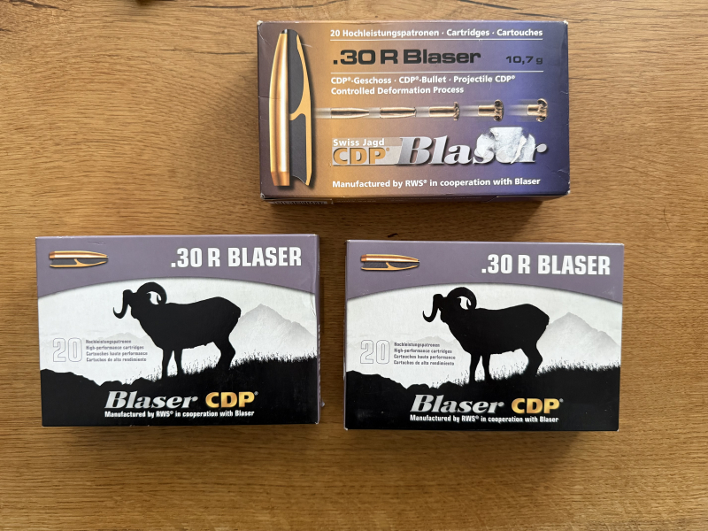 zum Verkauf stehen zwei Packungen Blaser CDP in .30R Blaser 165gr./10,7 Gramm, wovon eine Packung original versiegelt ist. Zusätzlich 17 Blaser Hülsen welche nur einmal abgeschossen worden sind.