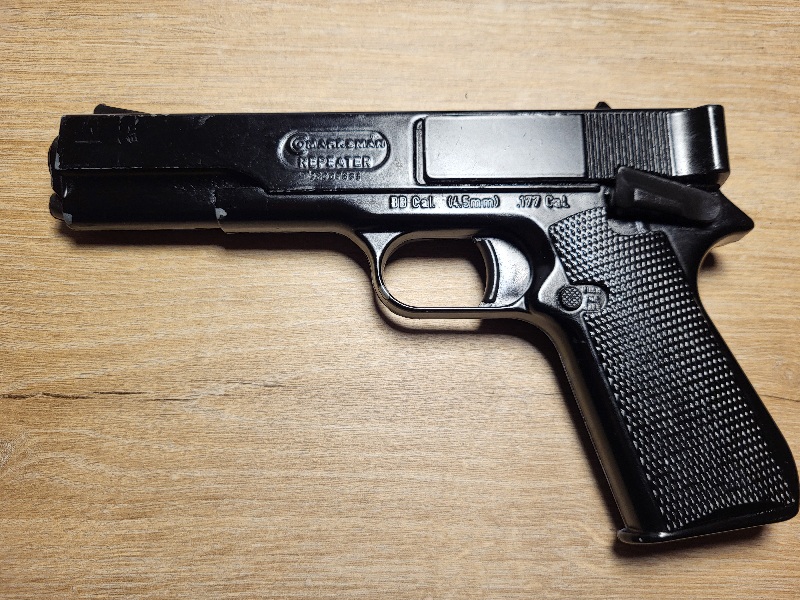 Verkaufe eine Marksman Repeater im Kaliber BB 4,5 mm / .177 | klassisches Repeater-Modell im Vintage-Look | Die Pistole ist gebraucht, jedoch insgesamt in ordentlichem Zustand | Es sind alters- und nutzungsbedingte Gebrauchsspuren vorhanden (siehe Bilder, vorn/seitlich kleine Lack-/Abriebstellen) | Mechanik/Optik wie abgebildet | Ideal für Sammler, Bastler oder als dekoratives Stück für die Vitrine | Die Beschriftung ist gut lesbar (Marksman Repeater | BB Cal. 4,5mm / .177) | Griffflächen mit Struktur, liegt gut in der Hand | Verkauf erfolgt genau so, wie auf den Fotos zu sehen | Versand erfolgt gut verpackt mit DHL | Privatverkauf: keine Garantie, keine Gewährleistung, keine Rücknahme | Abgabe ausschließlich an Personen ab 18 Jahren | Altersnachweis erforderlich
