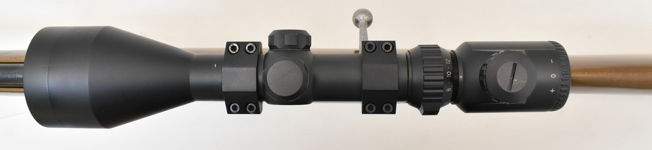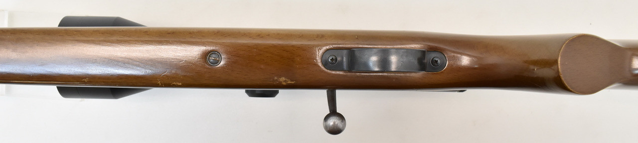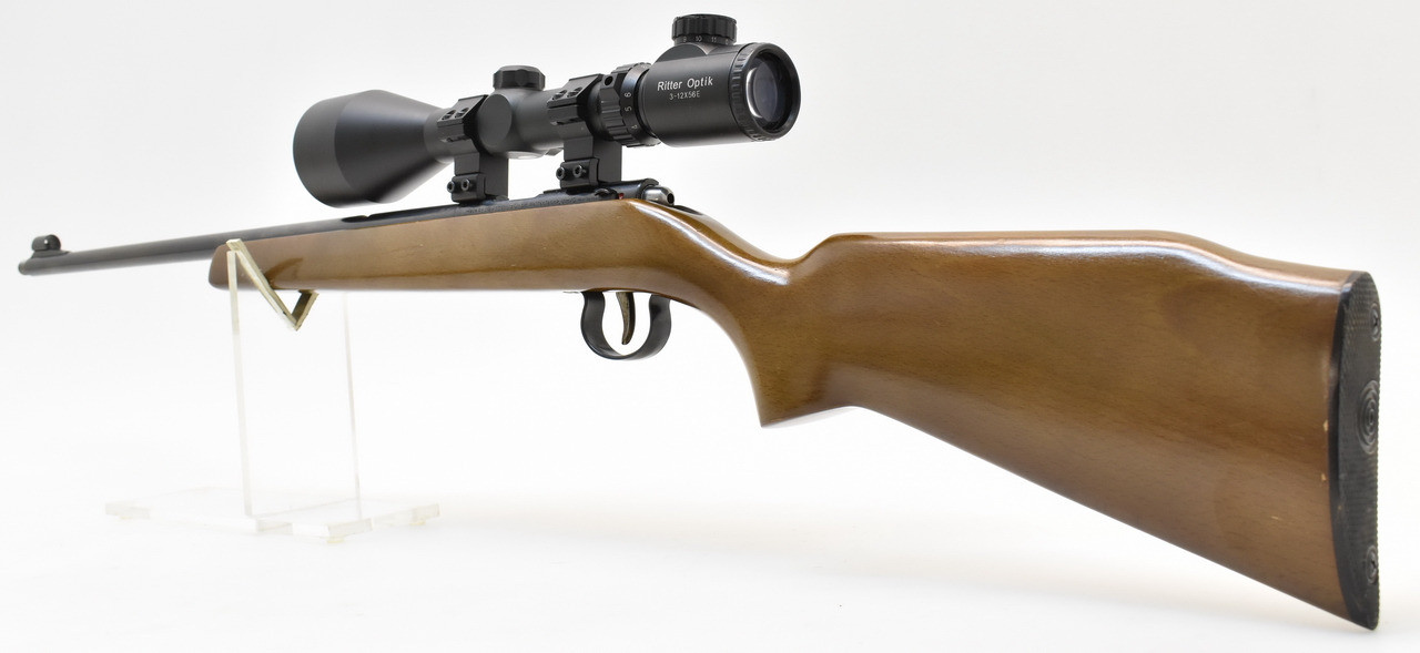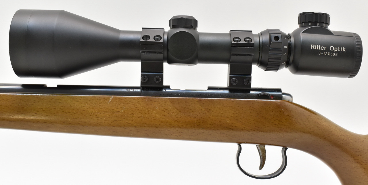 Handliche KK-Büchse mit einem Direkabzug und einem halb Zoll UMF Mündungsgewinde. Der Lauf ist spiegelblank. Montiert ist die Waffe mit einem Ritter Optik ZF 3-12x56 E Leuchtabsehen. Ulmer Beschuss von 1970.