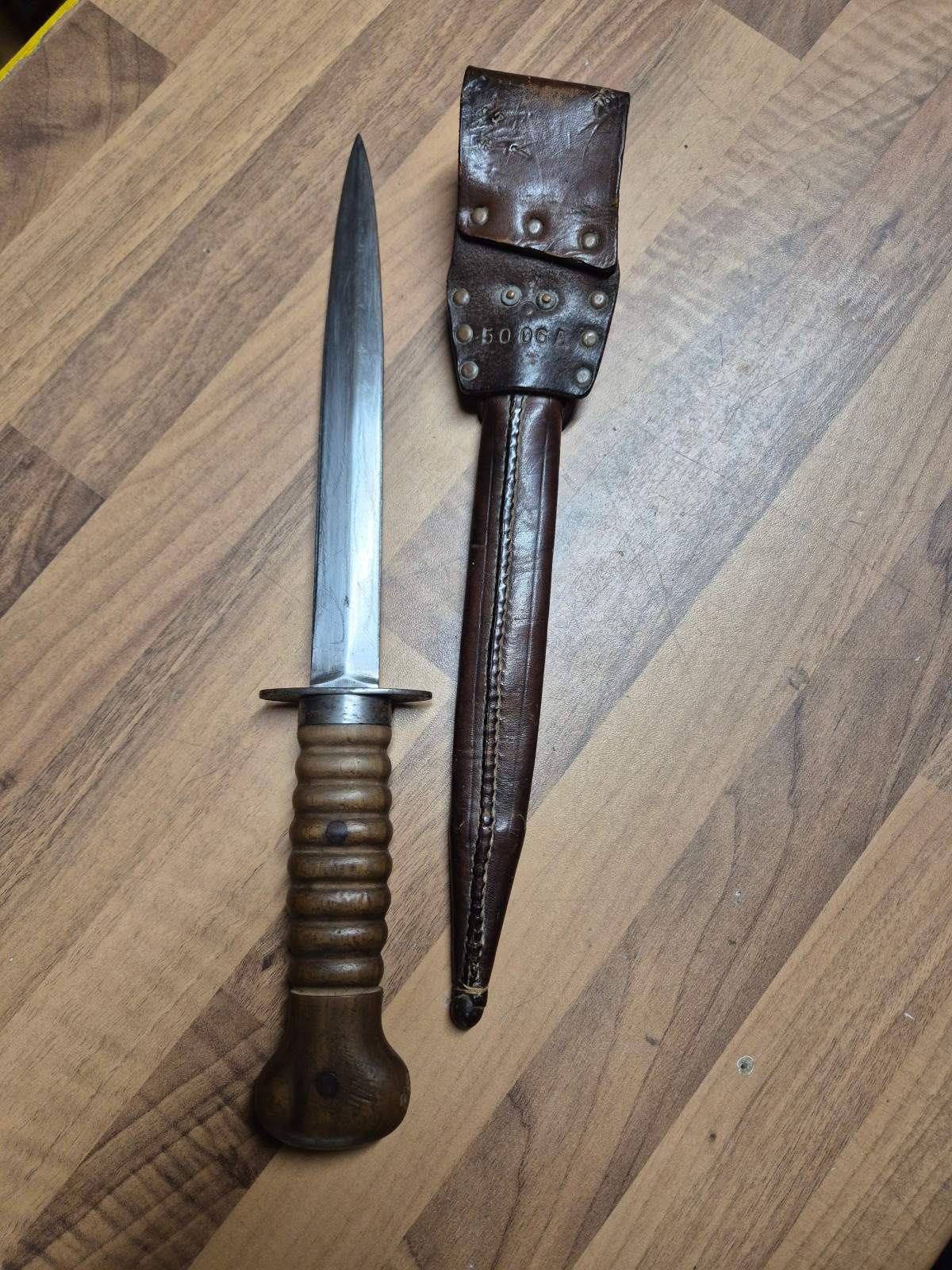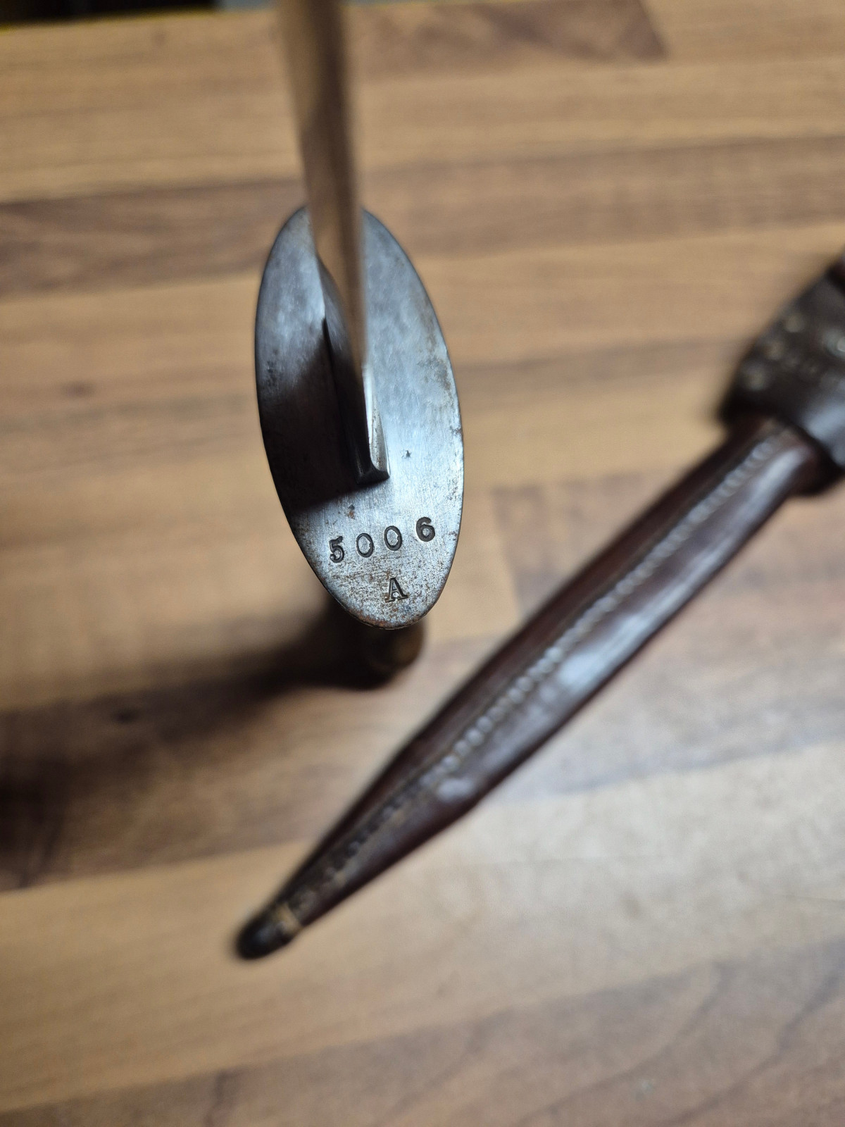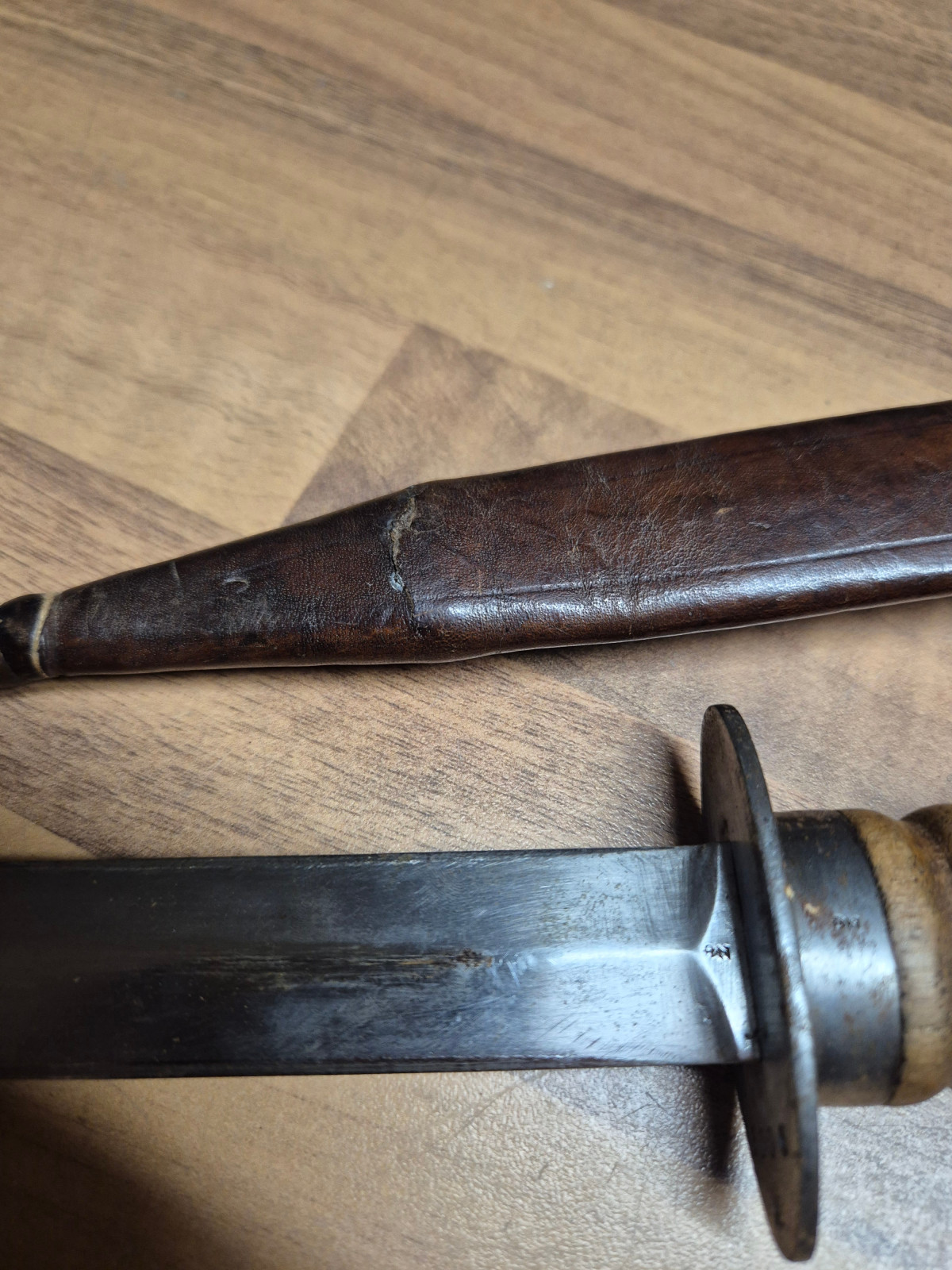 Hallo, biete hier einen niederländischen Stormdolk aus dem 1 Weltkrieg an.Die Scheide und der Dolch tragen die gleiche Nummer. Bitte beachten Sie, dass sich am unteren Teil der Scheide ein kleiner Riss im Leder befindet.Auch die Klinke sieht mir schlecht bearbeitet aus.