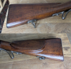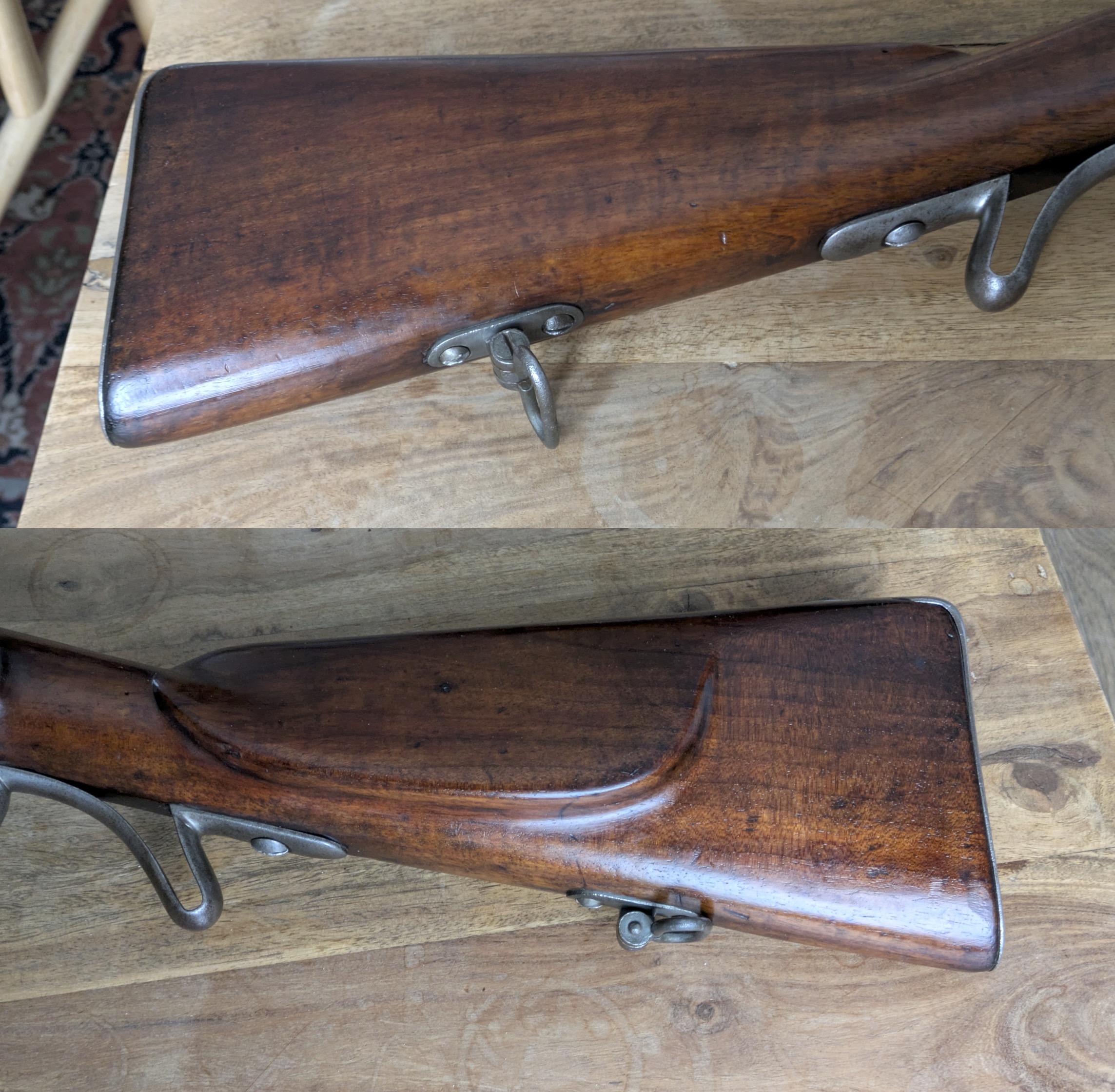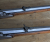 Das Laufinnere hat gute deutliche Felder und Züge und ist etwas rau (Bild 6). Das Schloß ist stramm und rastet in 2 Positionen. Der Schaft ist aus Nussbaum. Das Holz hat ein paar wenige Wurmlöcher und ein paar übliche Macken aus der Benutzung. Links an der Spitze des Vorderschafts wurde ein Ersatz angestückelt (Bild 4).