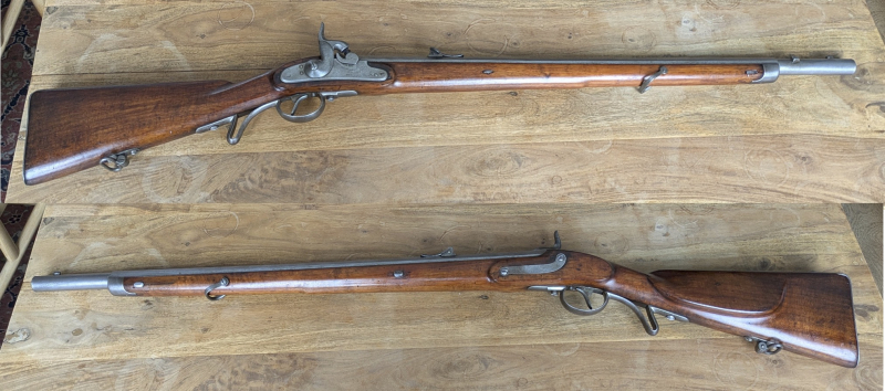Ein Stück Geschichte. Angeboten wird das abgebildete Gewehr, ein k. u. k. Jägerstutzen System Lorenz, Modell 1854. Das Gewehr wurde 1854 gefertigt, siehe Stempelung „854“ auf dem Schlossblech. Das Schloss, die Schlossschrauben, die Schwanzschraube, der Laufkeil sind nummerngleich gestempelt mit Zusammenbaunummer 34. Alle Keile und Schrauben inklusive Visier und Piston sind gut gängig.