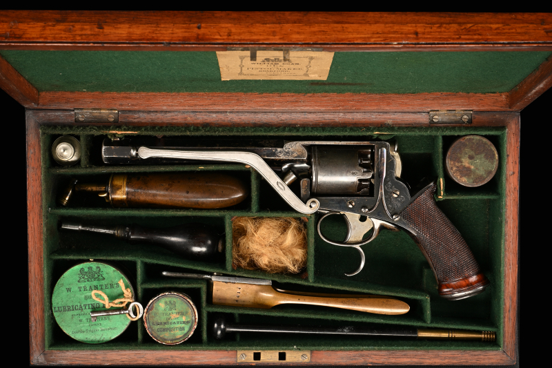 A FINE CASED 54-BORE TRANTER PATENT SECOND MODEL FIVE-SHOT DOUBLE-TRIGGER PERCUSSION REVOLVER RETAILED BY EGAN, BRADFORD serial no. 4191, 11 3/4in. overall, with blued octagonal sighted barrel engraved with a band of foliage at the muzzle, border engraved case-hardened cylinder, blued top-strap signed 'EGAN. BRADFORD', scroll engraved blued frame and trigger-guard, chequered walnut butt, scroll engraved case-hardened pommel, detachable Tranter patent rammer, and much original blued finish, London proof marks, in original lined and fitted mahogany case with accessories including brass double-cavity bullet mould (numbered '4414'), powder-flask and brass-mounted ebony cleaning rod with worm, the lid with William Egan trade label, the exterior with circular brass escutcheon.