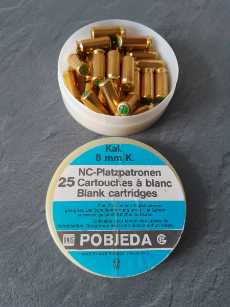Biete hier eine Dose alte 8mm Knall Munition aus den 80er Jahren, noch mit vollem Gasdruck.