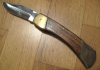 Das erste Klappmesser hat keinen Herstellernamen. Die Griffschalen sind aus Holz mit Messingelementen. Die Messingelemente sind angelaufen, die eine Klingenseite zeigt Kratzer. Die Gesamtlänge beträgt 22,3 cm.