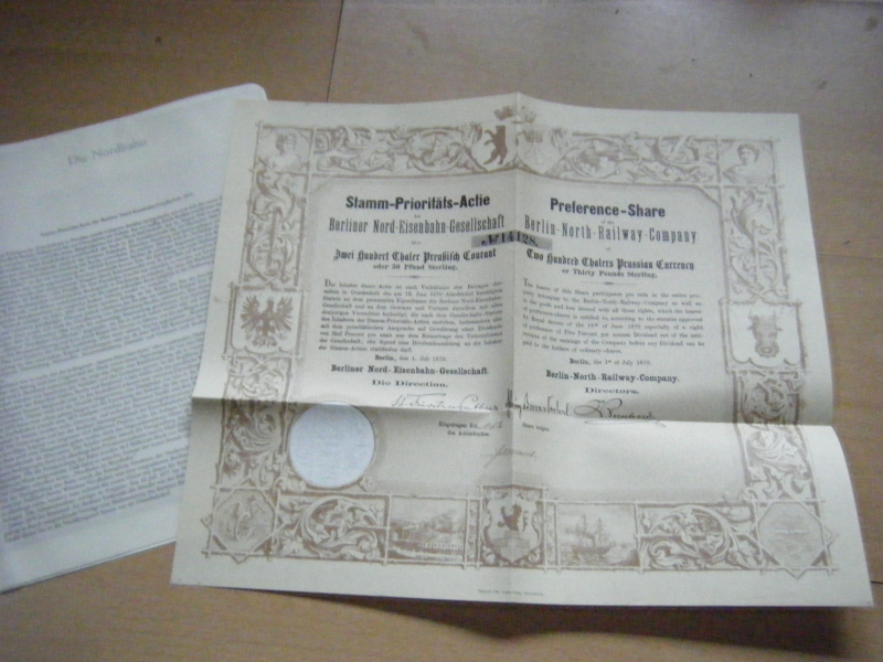 Aktie Stamm- Prioritäts- Actie der Berliner Nord Eisenbahn- Gesellschaft, von 1870. Berlin Archiv FAKSIMILE . In Sammlerhülle mit Erläuterungen auf dem tranparenten Umschlag. Zustand sehr gut.. Reproduktion wichtiger Dokumente der Geschichte