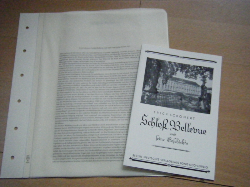 Schloss Bellevue und seine Geschichte, Broschüre bebildert, 20 seitig. Berlin Archiv FAKSIMILE . In Sammlerhülle mit Erläuterungen auf dem tranparenten Umschlag. Zustand sehr gut.. Reproduktion wichtiger Dokumente der Geschichte
