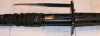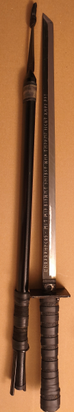 Wahrscheinlich 420er Stahl. Graviert, geschärft (sehr scharf). Teile mit Leder verstärkt und Schrumpfband. Hat einige Gimmicks - zwei Beimesser, eine anschraubbare Spitze für die Scheide, die in der Hülle "versteckt" war. Es wurde eine andere fest verbaut, die originale befindet sich wieder in der Hülle (hat er zumindest so geschrieben und fotografiert, ich hab das Schrumpfband nicht gelöst).