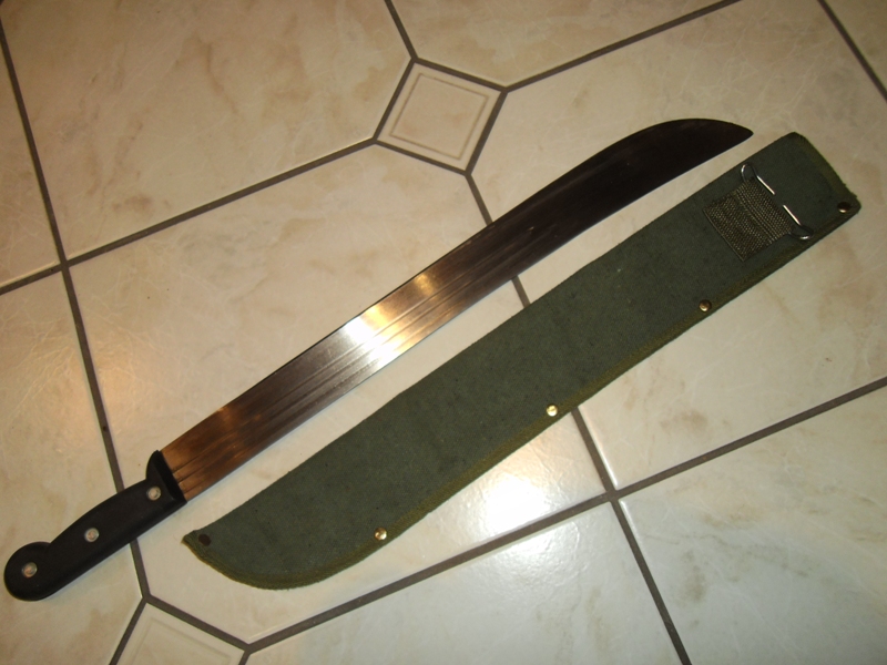 Stabile Arbeitsmachete/Jagdmesser/Buschmesser/Hackmesser, robuste Konstruktion und scharfe Klinge, ergonomischer genieteter Griff 12 cm lang, aus Kunststoff mit Fingerschutz Klinge 50 cm lang und 4,5-5 cm breit mit 3 Querrillen, vorderer Rücken ebenfalls scharf, Aus olivgrün farbigem stabilem Segeltuch Scheide 53 x 8 cm mit Nieten verstärkt und Befestigung für Koppel und Gürtel. Gesamtlänge: ca. 59 cm