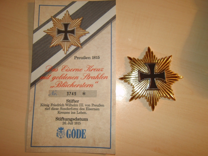 Das Eiserne Kreuz mit goldenen Strahlen „Blücherstern“. Göde Abzeichen mit Aufhänger auf der Rückseite versehen, leicht gewölbte Form. Gösse 8 x 8 cm. Im Eisernen Kreuz keine Beschriftung. Replik, Sammler- oder Museumsausfertigung. Kreuz nachgeklebt. Guter optischer Zustand.