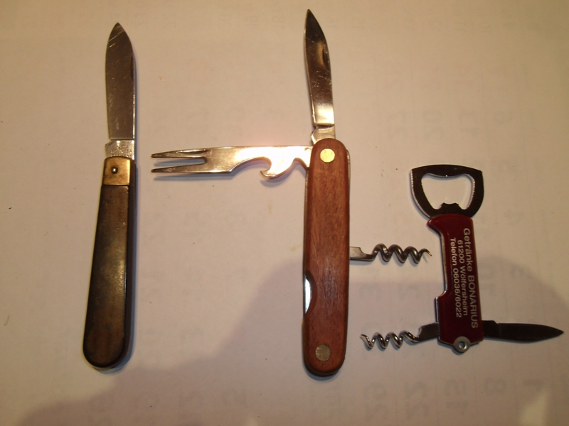 Mehrere Taschenmesser 1 x INOX Solingen Germany 15 cm (dunkelbrauner Griff) und andere Taschenmesser Stainless Rostfrei 17 cm mit Öffner/Gabel, Korkenzieher und 1 Messer. Griff Holz oder Holzmaserung oder Kunststoff. Zugabe Werbegeschenk mit Öffner, Korkenzieher und Messer