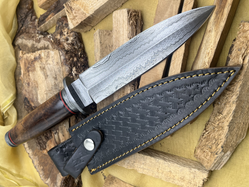 Über 200 Lagen Damast • 7" Klinge • 5" Griff • Walnussholzgriff • Damast-Parierstange • Dolchmesser • Inklusive Scheide
