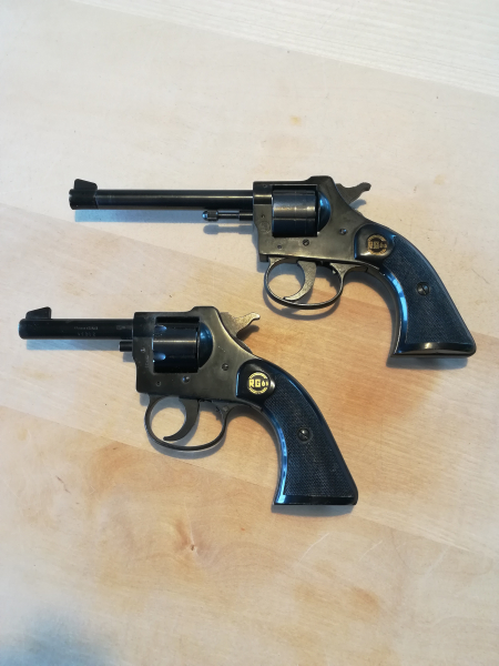 2 x Revolver Röhm RG 6 s, 1x Kaliber .22 l.r. ( oben im Bild ), 1x Kaliber 6mm Flobert Knall ( unten im Bild ) , Zustand gut, Verkauf nur an Händler und Sammler da beim .22 er kein gültiger Beschuss bzw. beim Flobert kein PTB-Zeichen. Beim Flobert fehlt die Ausstoßerstange.