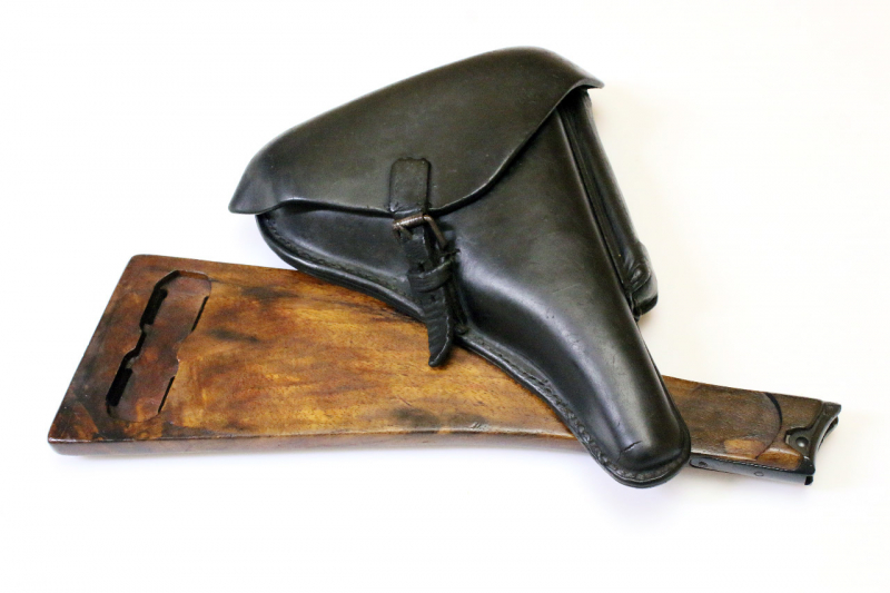 Lederne Hartschalentasche. Das Leder glatt. Die Rückseite benummert „L 5 8 2“. Die Rückseite ohne Modellbezeichnung. Der Deckel innen gestempelt „Handwerkskammer von Oberfranken“. Keine weiter Stempelung erkennbar. Aufgesetztes Fach für das Reservemagazin. Im Deckel ein Fach für den Werkzeugschlüssel. Der Werkzeugschlüssel fehlt. Die Tasche mit einem Zugriemen ausgestattet. Der Zugriemen intakt.