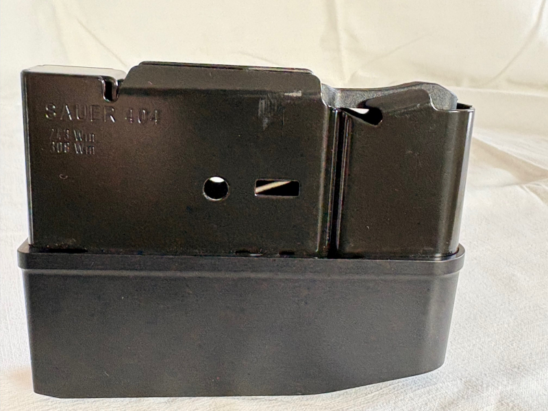 Verkaufe wegen Überbestand ein so gut wie neues, sehr wenig benutztes 5-Schuss-Magazin für eine Sauer 404, für die Kaliber .308 win und .243 win. Das Magazin ist aus Metall.