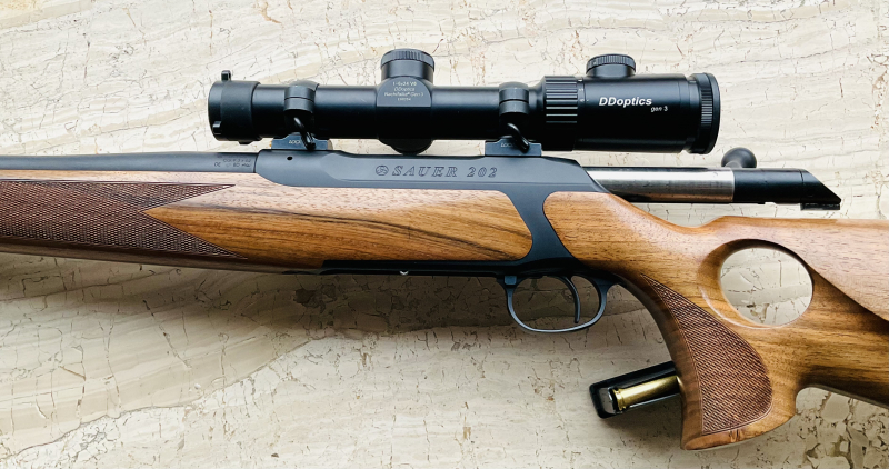 Sauer 202 GTI Klassik, Kaliber 9,3 × 62, Lochschaft, Kombiabzug mit Stecher, Heavy-Medium Lauf 19mm ungekürzt in Originallänge.