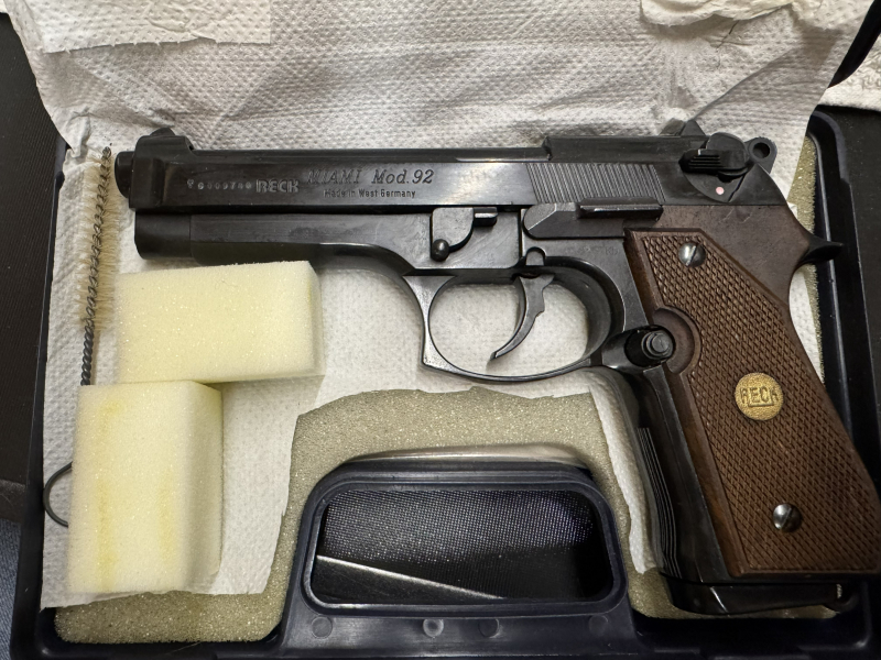 Hallo, zum Verkauf steht eine Schreckschusspistole von Reck Miami Mod.92 im Kaliber 8mm Knall. Die Waffe stammt aus einer Sammlerauflösung und ist in einem sehr guten Zustand. Mit dabei ist eine Reinigungsbürste und der originale Koffer.