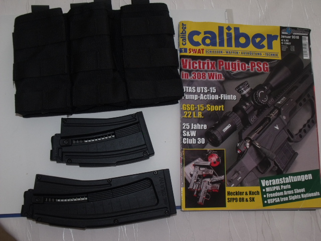 für mich sieht es so aus, als wenn beide Magazine auf 10 Patronen begrenzt sind. 3er Magazintasche, für die kurzen Magazine steckt man z.B. etwas Schaumstoff rein, damit die kurzen Magazine oben raus schauen. Als Beilage eine Caliber Zeitschrift 1 / 2018 mit einem Bericht zur GSG 15 Sport. Versicherter Versand mit DHL vorgesehen. Privatverkauf, ohne Gewährleistung, Garantie, Wandlung, Rücknahme, u.s.w.