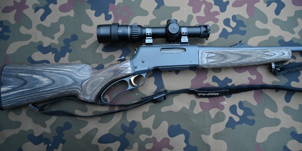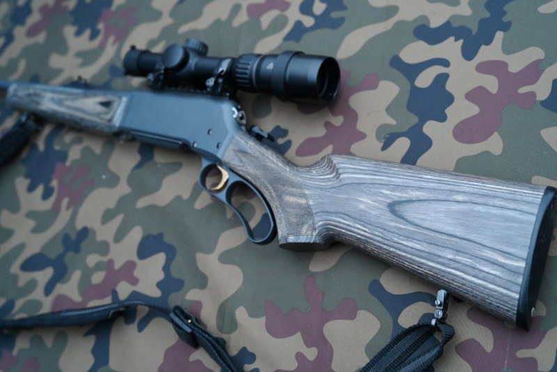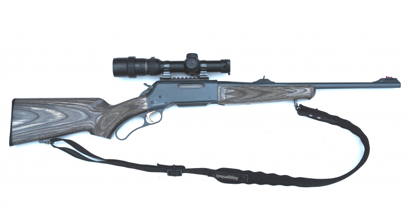Unterhebelrepetierer, Unterhebel-Repetierbüchse, Jagdgewehr, Jagdwaffe mit außenliegendem Hahn, Unterhebelspannung, herausnehmbaren Magazin und ZOOM-Zielfernrohr BURRIS Four Xe 1-4x24, Absehen 4 NK (Fadenkreuz) mit in 11 Stufen dimmbarem Leuchtpunkt: