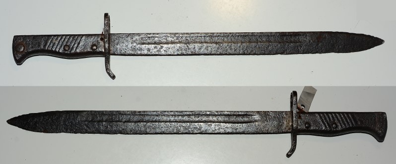 Seltenes Ersatzbajonett, Griff wie 98/05 aber andere Klnge, Klingenlänge 35,6 cm, leider stark rostig und ohne Scheide, Schlachtfeldfund aus Frankreich