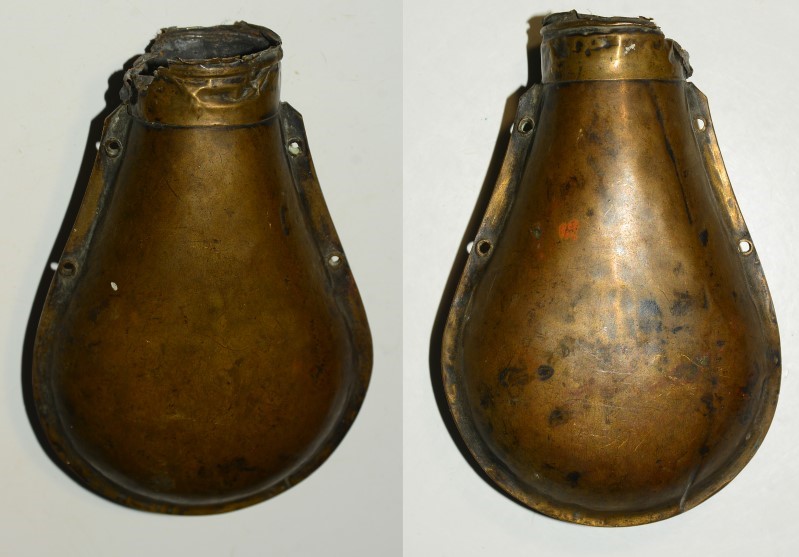Pulverflasche aus Kupferblech. Höhe 12 cm, Leider fehlt die Tülle samt ihrer Montage, ansonsten keine Mängel, Mitte des 19. Jahrhunderts