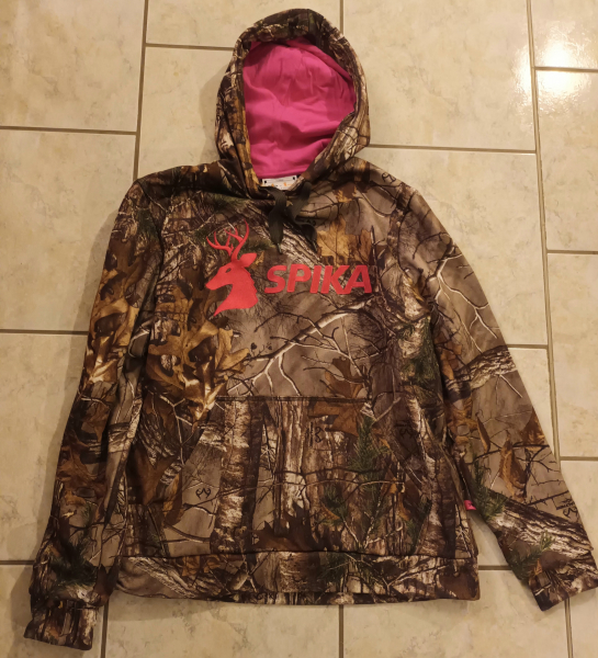 Klassisch geschnittener Hoodie mit per Kordel verstellbarer Kapuze, Daumenlöchern und großer, warmer Handwärmetasche vorne. Farbe: Realtree, Marken-Label und Kaputze innen Pink....Privatverkauf, usw...