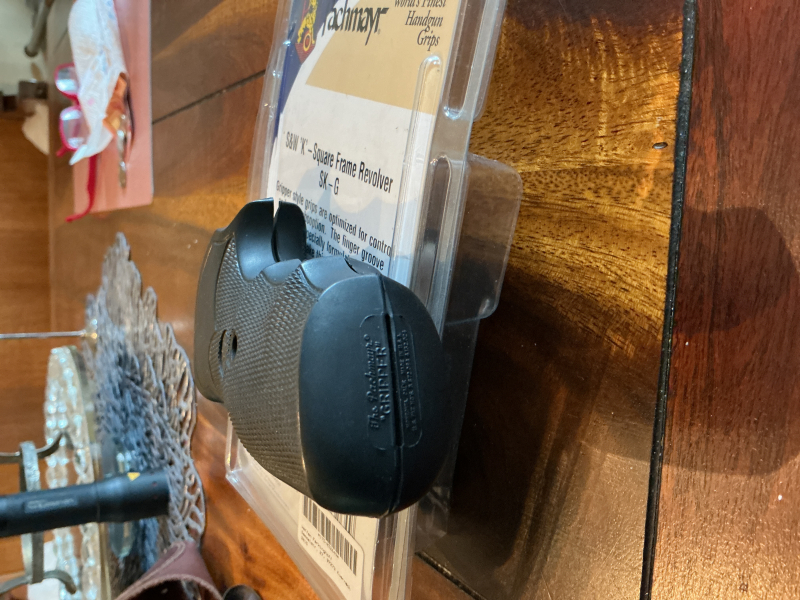 Griffschalen der top Firma Pachmayr Gummigriff K Modell an einer 357 Mag. Smith Wesson 686 , 2 Wochen montiert gewesen, liegt mir nicht so, leider ist die kleine Schraube aus der Mitte verloren gegangen.