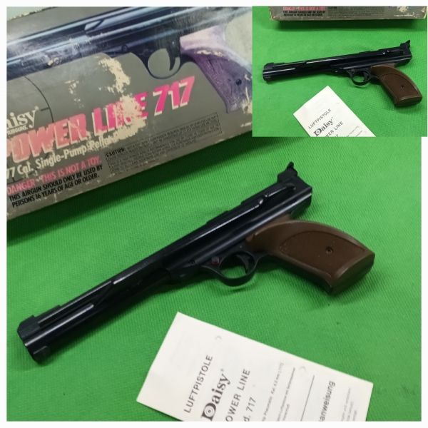 1. Daisy 717 Seitenspanner Luftpistole mit orig. Karton und Bedienungsanleitung. Cal. 4,5mm / .177 Diabolo. F im Fünfeck vorhanden. ABSOLUT SCHUSSBEREIT / Bestzustand. Dichtungen / Kolben und Spannfeder erneuert. Die LP liegt Mega gut in der Hand. Griff ist für Rechtshänder. Super schöne Waffe zum TOP Preis. Schießt tadellos ohne Probleme - KEINE TECHNISCHE MÄNGEL BEKANNT. Viel Spaß beim Bieten und beachten Sie bitte auch meine anderen Auktionen. Zustandsbeschreibungen unterliegen immer einer persönlichen Betrachtung bzw. Einschätzung, im Zweifelsfall sind die Bilder in der Auktion ausschlaggebend. Differenzbesteuerung nach § 25a UStG. Die Waffe ist ab 18.Jahre frei erwerblich und nicht EWB-pflichtig. BEI FRAGEN ZUM KAUF TELEFON 07356-9509284. Ich schließe jegliche Sachmangelhaftung aus. Die Haftung auf Schadensersatz wegen Verletzungen von Gesundheit, Körper oder Leben und grob fahrlässiger und/oder vorsätzlicher Verletzungen meiner Pflichten als Verkäufer bleibt uneingeschränkt ----!!!---- KEIN internationaler Versand (NO international shipping) MFG