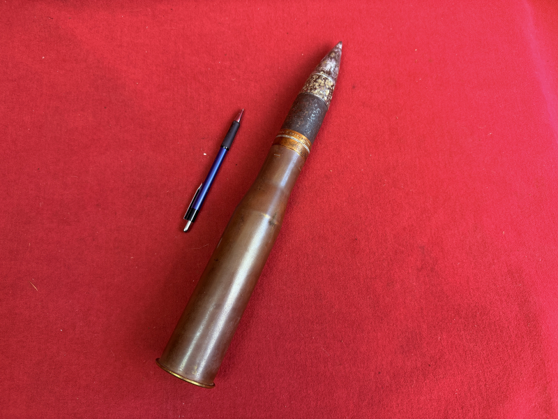 Es handelt sich hier um eine Hülse mit Geschoss, Hülsenboden Kennzeichnung: 37mm. M16, 1942, LOT 50035 - 19 F.A.