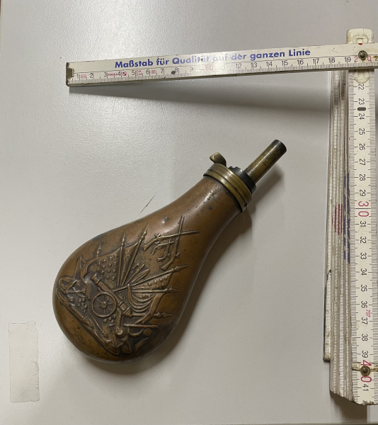 Zum Verkauf steht eine Replik (Neuzeitliche Fertigung) einer historischen Pulverflasche aus Messing. Dieses Modell besticht durch sein detailliertes militärisches Relief und die schlanke, elegante Form.