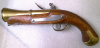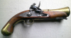 Sehr dekorative Steinschloß-Pistole mit trichterförmig erweitertem Messing-Deko-Lauf. Der Lauf geht von Achtkant auf rund über. Die Pistole ist ca. 30 cm lang und wiegt rund 1020 Gramm. Ladestock, Abzug, Schloß und Gegenplatte sind aus Stahl (magnetisch), Abzugsbügel, Schaftkappe und Lauf aus Messing. Der Hahn rastet zweimal, die Feder ist in der ersten Rast etwas schwach. Die Pistole hat keinerlei Stempel, Gravuren oder Beschriftungen, sie ist nicht schußfähig, sondern ausschließlich zu Dekorationszwecken gebaut!