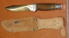 Zum Verkauf kommt ein Jagdmesser mit Holzgriff und Lederscheide