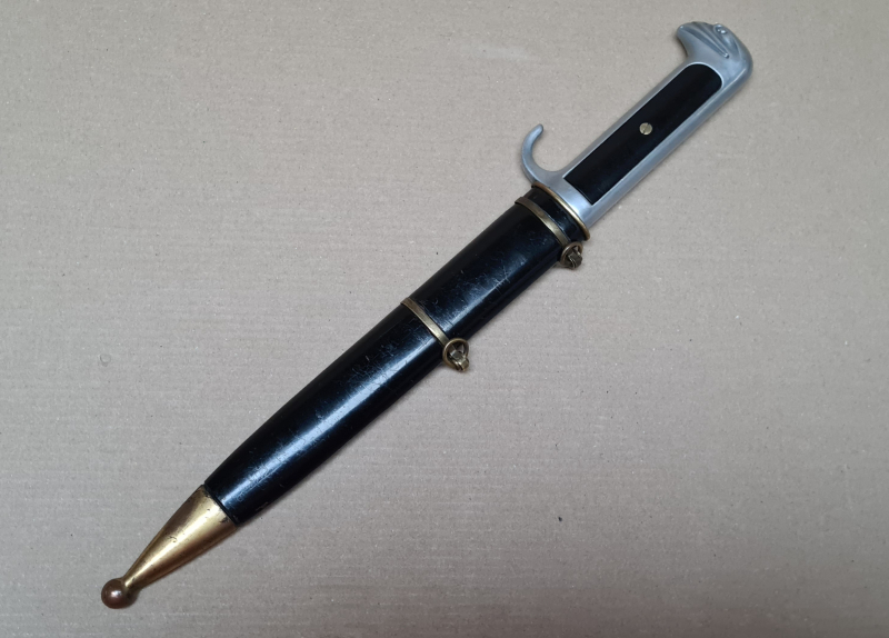 Schwarz lackierte Scheide. Gesamtlänge mit Scheide ca. 34 cm,