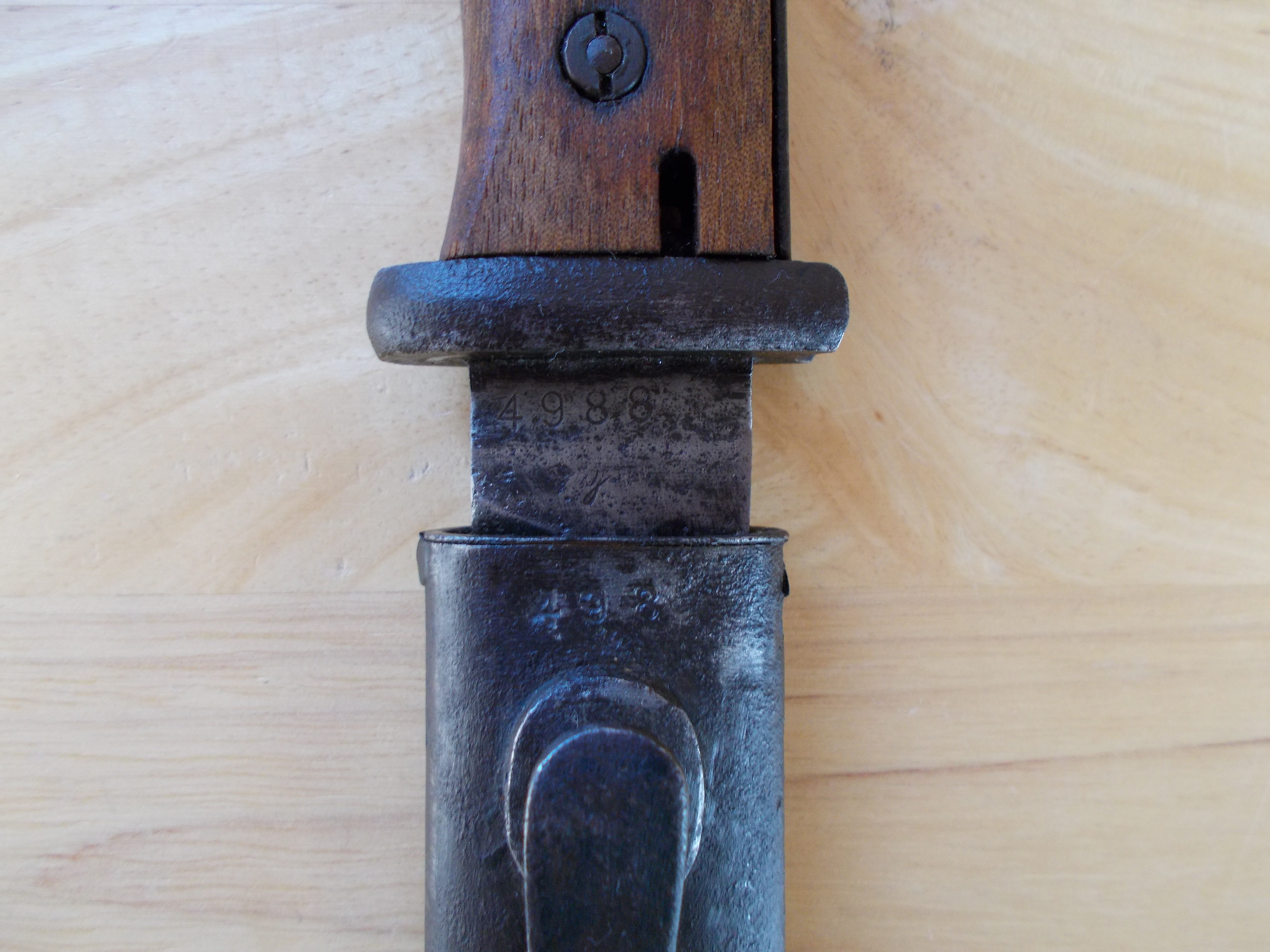 Wehrmacht Seitengewehr 84/98, 3.Mod., nummerngleich 44cvl/4988g, Klinge mit Schleifspuren.