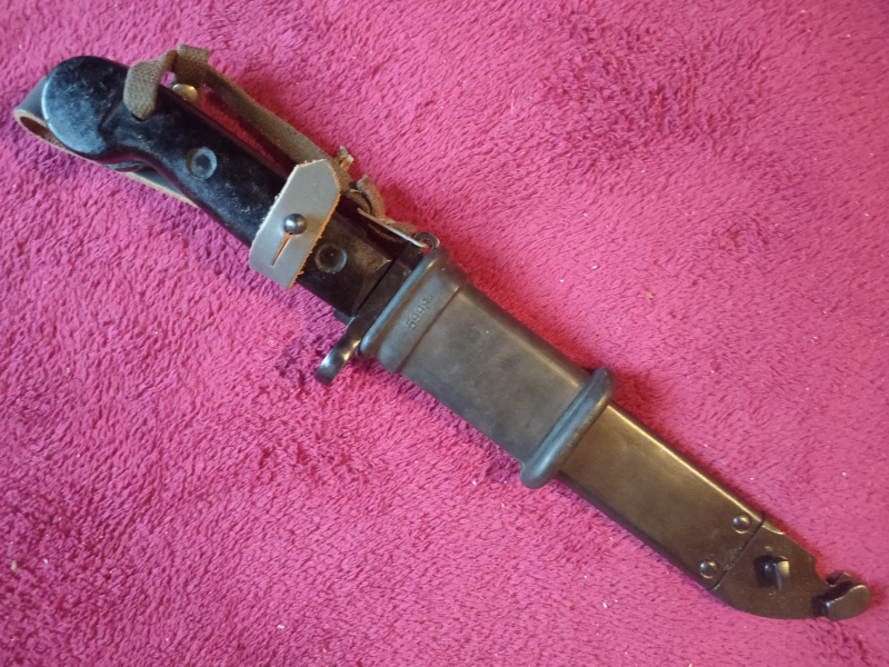 NVA Bajonett mit Bakelitgriff und Stahlscheide mit Gummi Manschette. Verriegelung gängig. Beschriftung kein Hersteller erkennbar. Auf der Scheide steht die Nummer: 5998 .