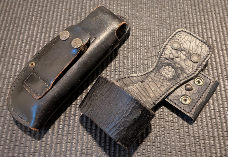 Das Holsterelement an sich ist in besserem Zustand, hier ist das Leder noch in Ordnung, es hat aber auch schon viele Gebrauchsspuren und Stoßstellen, abgewetzte Kanten.