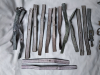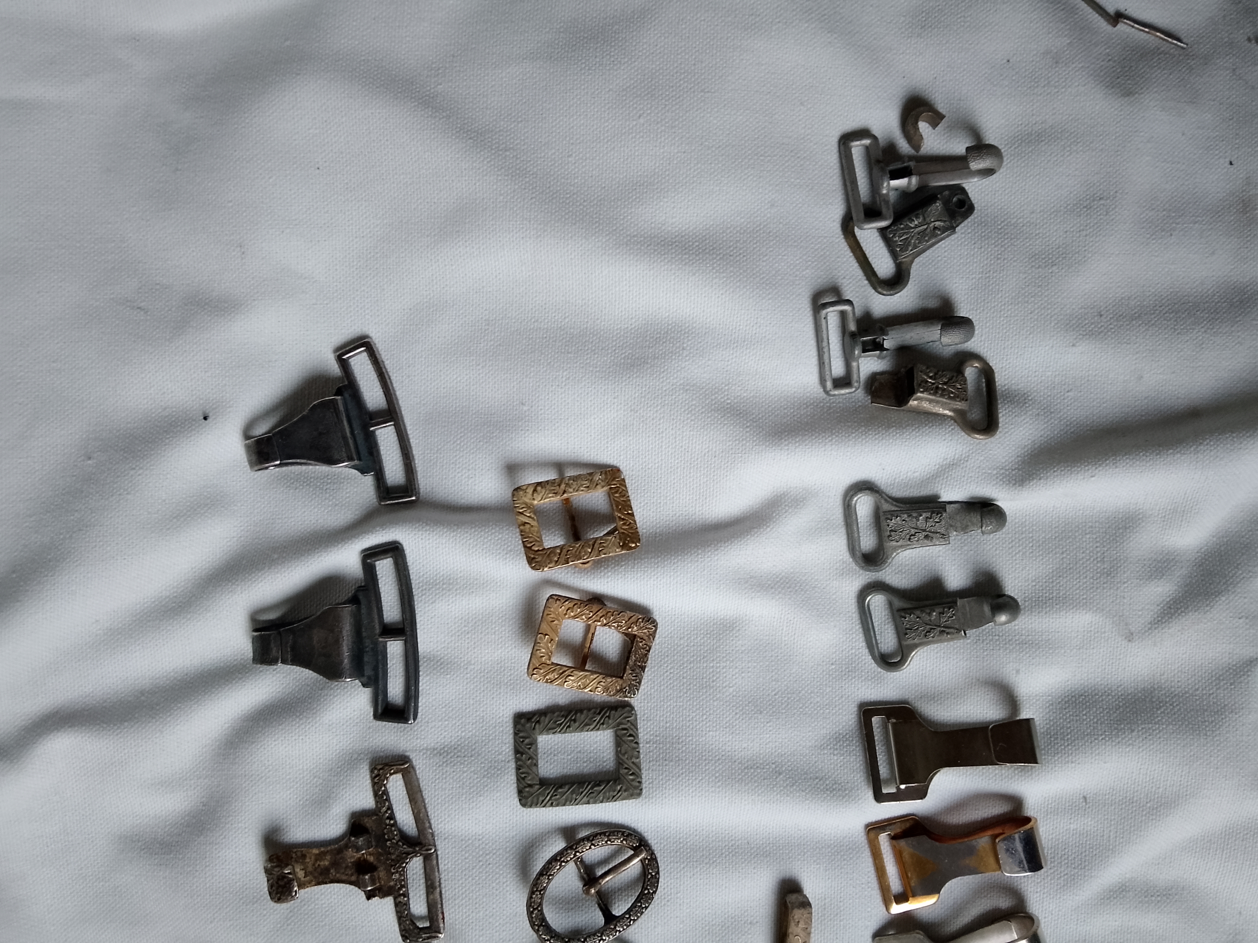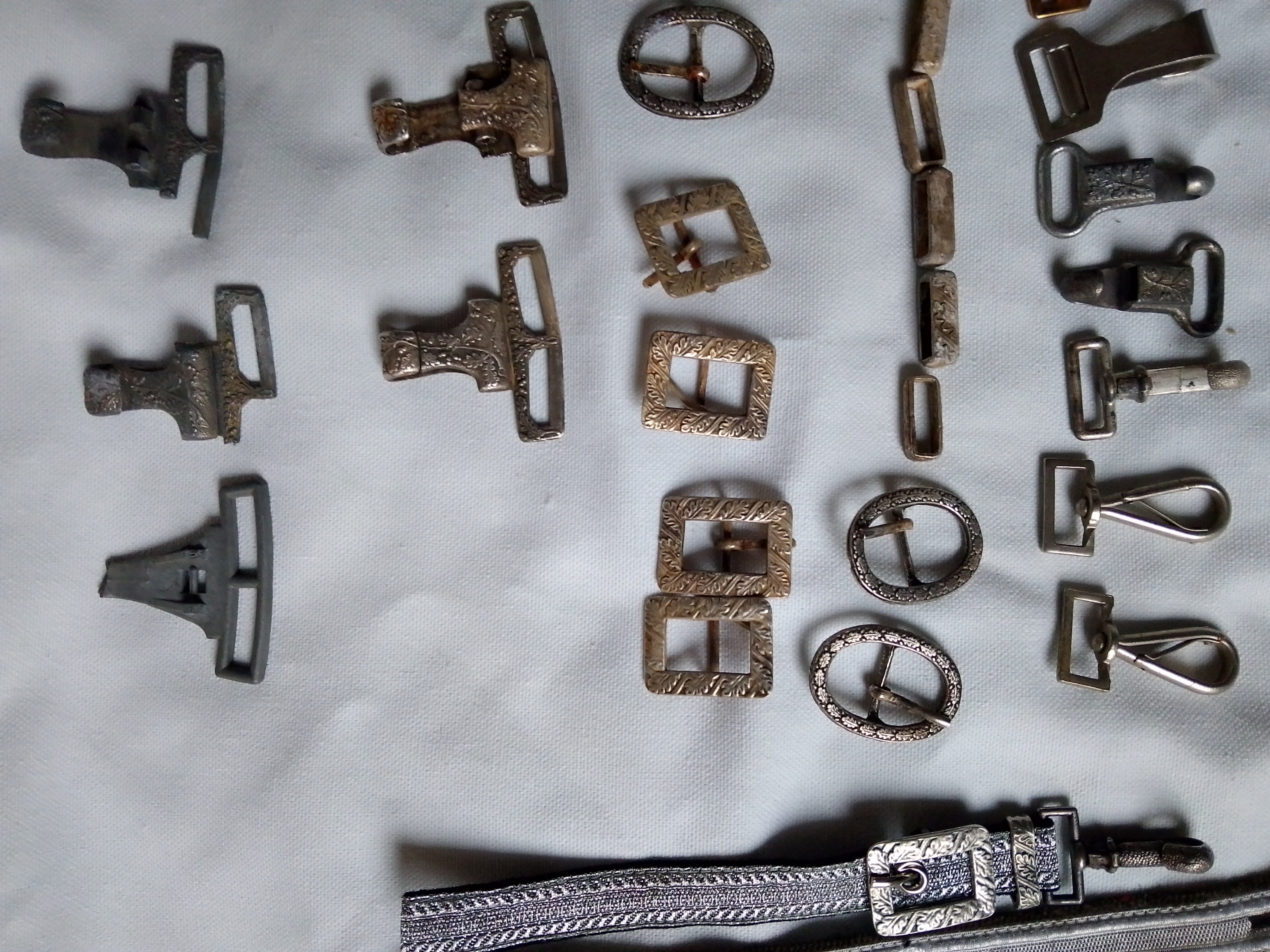 aus der Auflösung einer Solinger lederwarenfabrik stammen diese Ersatzteile für Gehänge, mit dabei schon bereits vorgenähte Gehänge diverse Haken Schnallen, oberer Haken und so weiter, dabei ist Litze für den Heeres Dolch für den Diplomaten und staatsbeamten durch einen bereits zur Hälfte fertig gestelltes Gehänge, Presse mit grünen durchzügen vermutlich für Lanzolldolche,